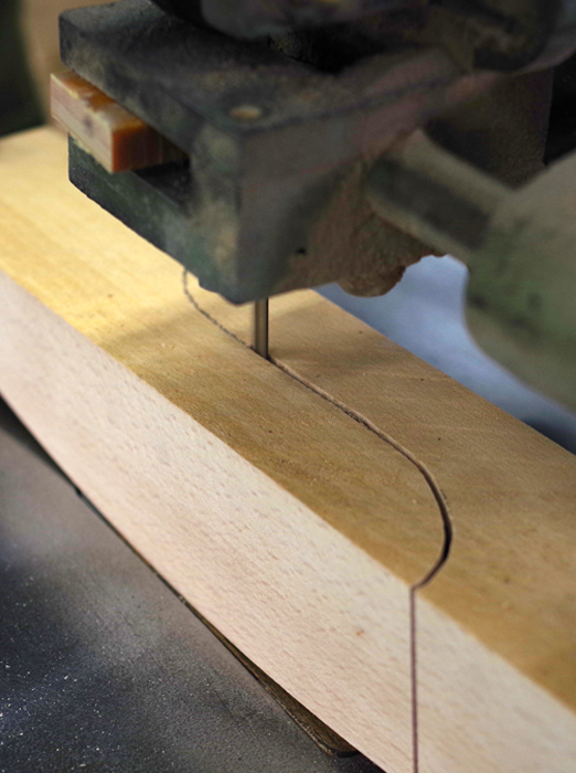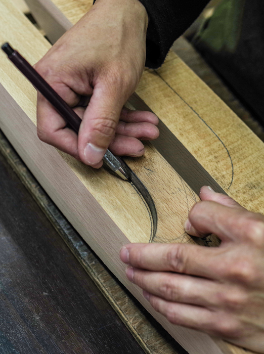 帯鋸を使用して材料を加工するために、木材に鉛筆で図書きをします。その後、木材に描きこんだ線を頼りにカットしていきます。例えば、NAKATA HANGERを代表するAUT-05型を作る際は均等な大きさになるように1つの木材を2つに切り分けます。貴重な材料をできるだけ無駄にせず有効的に使うためです。木材の表面に描かれたS字のラインは、ハンガー製作において象徴的なラインとも言えます。