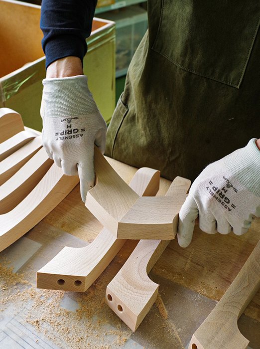 ここでは左右の木柄を合わせていきます。たくさんある木部の中から左右が自然にそろっているように見せるためには、瞬時の判断力と観察眼が必要です。無垢材を使用しているので木柄には1つとして同じものがありません。人に個性があるように、ハンガーにも木柄という個性があります。木目をそろえることで木の個性を活かすとともに、上品な仕上がりを生み出します。形状は同じでも、まさに世界に1つしか存在していない木柄のハンガーを生み出すことになるのです。