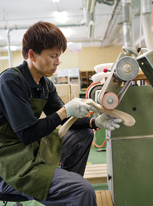 ここでは様々な角度から背面や底面も含めたハンガーの全てを磨き上げます。高速で回転するサンドペーパーにハンガーを押し当てながら削り出す作業には、適度な力と高度な技術が必要となります。ハンガーの形を仕上げる最終工程ですから、1本1本しっかりと完成形をイメージしながら見極めていくことが重要です。左右対称の形を目指してバランスが崩れないように磨き上げることは至難の業です。頼りになるのは自分の目や手といった感覚だけなので、マスターするまでに10年はかかるのではないかと思います。