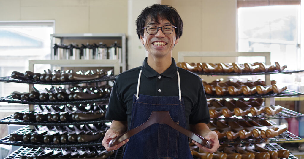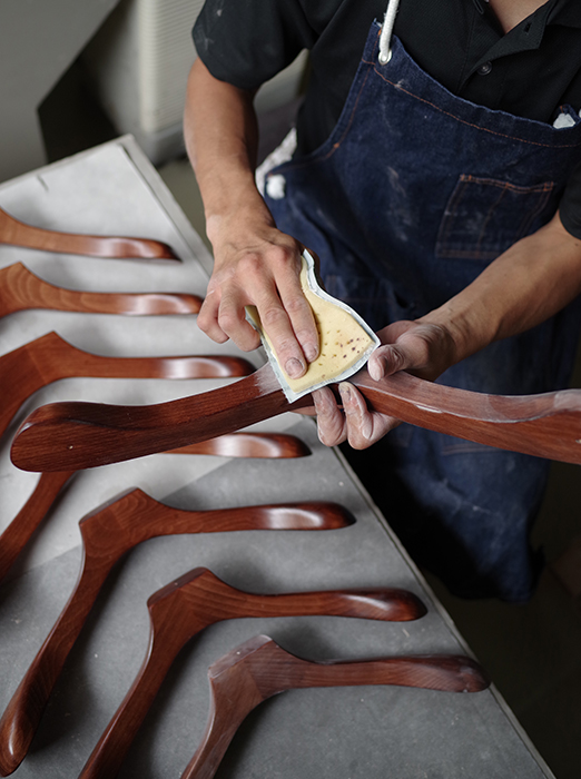 僕は、その奥深さに魅了されました。工程が沢山ある事、1本1本手作業で作られている事、そして職人の熱い想いが詰まっている事…。一度現物を手にとっていただけたなら、想像を遥かに超えるクオリティと美しさ、そして奥深さ故に『おっ!』と思わず一言、漏れるはずです。ハンガーそのものに、本物であると納得していただけるだけの説得力がある。このハンガーにお気に入りの服をかけたときや、生活空間にハンガーがかかっているときなどに、幸せを感じることができると信じています。いつまでもこの製品が後世まで残るような作品に仕上げていく。それが僕たち職人のミッションです。