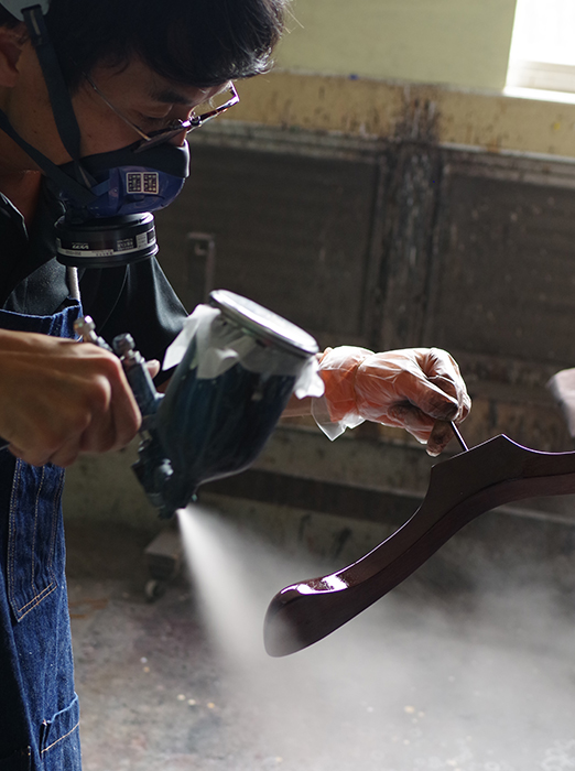 仕上げ塗料の調色ができれば、いよいよ仕上げ塗装です。スプレーガンを使って一本ずつ手作業で塗装します。ムラがないように均一に塗装していくことが重要です。そのためには吹き付ける距離や角度を調整して、ハンガー全体に色が乗るようにしていきます。塗装を施す際に見るものは、ハンガー表面の光です。もちろん色も見ていますが、光り方によって風合いや木目の透け具合、塗料の量、場合によっては微細なキズや汚れなどもわかるので、重視するのは光の方です。また、乾燥後に塗料がどのように変化するかをイメージしながら塗装を行い、必要があると判断すれば再び塗料の調整を行います。ツヤの強さや色味のブレなど、実際に吹き付けて初めてわかる調整点があるので、最後まで理想の仕上がりを追い求め続けています。木部としての品質に関わる加工はいよいよ最終段階です。木の美しさと色の美しさ、どちらも兼ね備えたNAKATA HANGERの良し悪しが決まる工程です。プレッシャーはありますが、これまで1本のハンガーに関わってきた職人たちの思いが感じられる工程なので責任を持って行っています。