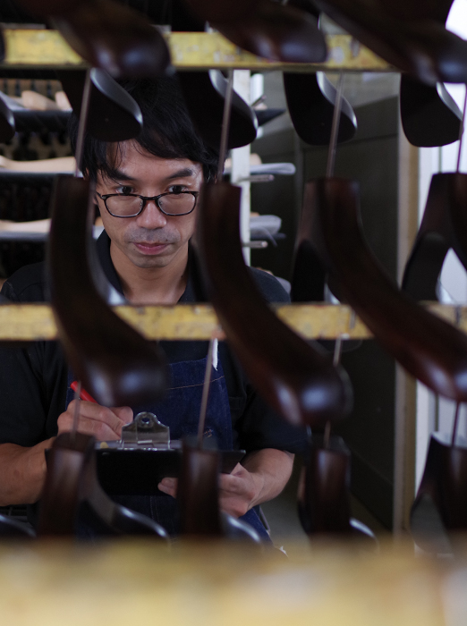 乾燥が終われば、組立工程へハンガーを渡す前に一度検品を行います。ここでも1本ずつ人の手で検品を進めていきます。色、艶、風合いはもちろん、表面の状態や異物の付着の有無、角のざらつきなどを確認します。もしも基準に満たないものがあった場合は、捨てるのではなくもう一度はじめから塗装をやり直します。確かに手間はかかりますが、少しでも木を大切に使いたいと考えているからです。検品の工程は商品に対する知識やモノを見る目、そして判断力が必要となります。ハンガーを手にとってくださったお客様に満足していただけるように、笑顔になっていただけるようにと思いながら、細かなところまでしっかりと確認しています。「お客様が出会う一本のハンガーが、その方に幸せをもたらす」そんな瞬間を思えば、自然と検品も厳しくなりますね。検品は、僕たち職人が一生懸命作ったハンガーを、自信を持ってお客様に送り出すために欠かせない非常に大切な工程です。職人の手で作られ、その目で見極めた本物のハンガーがお客様の手に渡るまで、あともう少しです。